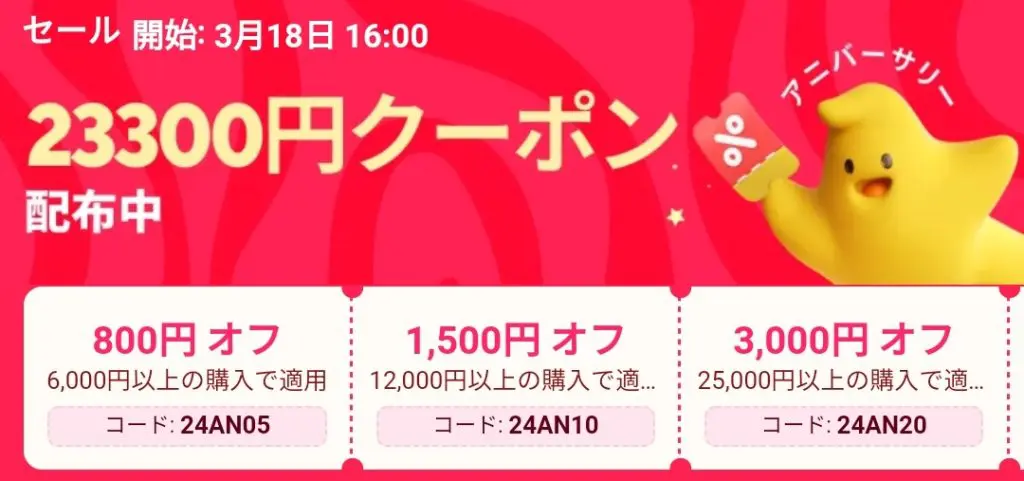 AliExpress2024年アニバーサリーセール期間は以下でした。
